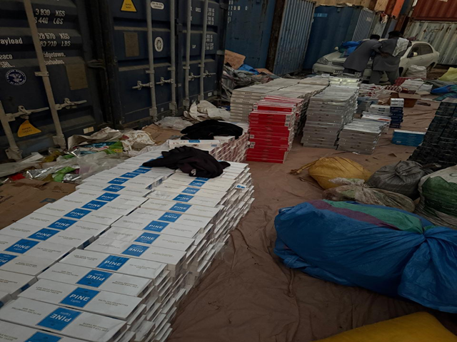 In a successful anti-smuggling operation, Customs Enforcement Karachi, with the assistance of Sindh Rangers, conducted a joint raid at Jodia Bazar, Karachi. The raid led to the recovery of foreign-origin smuggled goods. The seized goods include 2,320 packets of foreign-origin cigarettes, 9,620 kilograms of betel nuts, 140 packets of foreign-origin Niswar and 3,485 kilograms of foreign-origin cutch block.